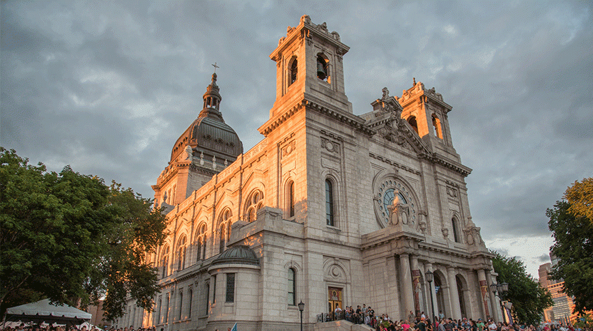 One of the finest examples of Neoclassical Beaux Arts Architecture in America, The Basilica of St. Mary cost one million dollars to build. Archbishop John Ireland met and selected architect Emmanuel Louis Masqueray to design the new cathedral. Masqueray designed the 1904 St. Louis World’s Fair and favored the late Renaissance and Baroque style churches in France, where he studied at the prestigious Ecole des Beaux Arts. Construction began in 1907, but it took six years to complete the exterior of the new cathedral: World War I strained parish resources and Masqueray died of a stroke in 1917. Complete in 1926, the cathedral was officially named the first Basilica in North America by Pope Pius XI. It was added to the National Register of Historic Places in 1975. Visitors can see the Basilica’s spectacular stained-glass collection, completed in 1924 and sculptures and paintings from the permanent art collection – but most Minneapolitans know the landmark building as the site of the late summer alt-rock and religion fest, The Basilica Block Party.