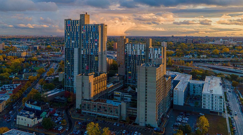 Designed by famous Minneapolis architect Ralph Rapson, who was also the Head of the School of Architecture at the University of Minnesota for 30 years, this apartment complex is a beacon to the Cedar Riverside neighborhood of Minneapolis. Initially called Cedar Square West, Riverside Plaza consists of six buildings with 1,303 residential units. The design was inspired by Rapson's time spent in Europe, where he witnessed people of all ages and wealth coexisting withing the same close quarters. Each building using multi-colored panels and are all different heights in order to reflect the diversity of its population. Riverside Plaza is an example of an urban redevelopment project by U.S. federal government HUD department as part of their New Town-In Town program and was the first to receive Title VII funding. It is now listed on the National Register of Historic Places.