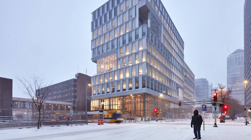 The Public Service Building (PSB) downtown was built for a winter city. In the freezing months, when plazas and streets are covered in snow, the extensive glass offers glimpses of the building's warm interior, and doors are intentionally placed on opposite sides of the wind tunnel formed by downtown's buildings. Designed by the Denmark-headquartered firm Henning Larsen, the windows that form the prism design are made of bird-safe glass, which has visual patterns birds can see, to prevent them from flying into the skyway bridge and above stories. Inside, the most notable feature you'll see is a 26-foot stone City of Minneapolis seal. Take a virtual tour of the PSB to learn more about the building and the art collection inside.