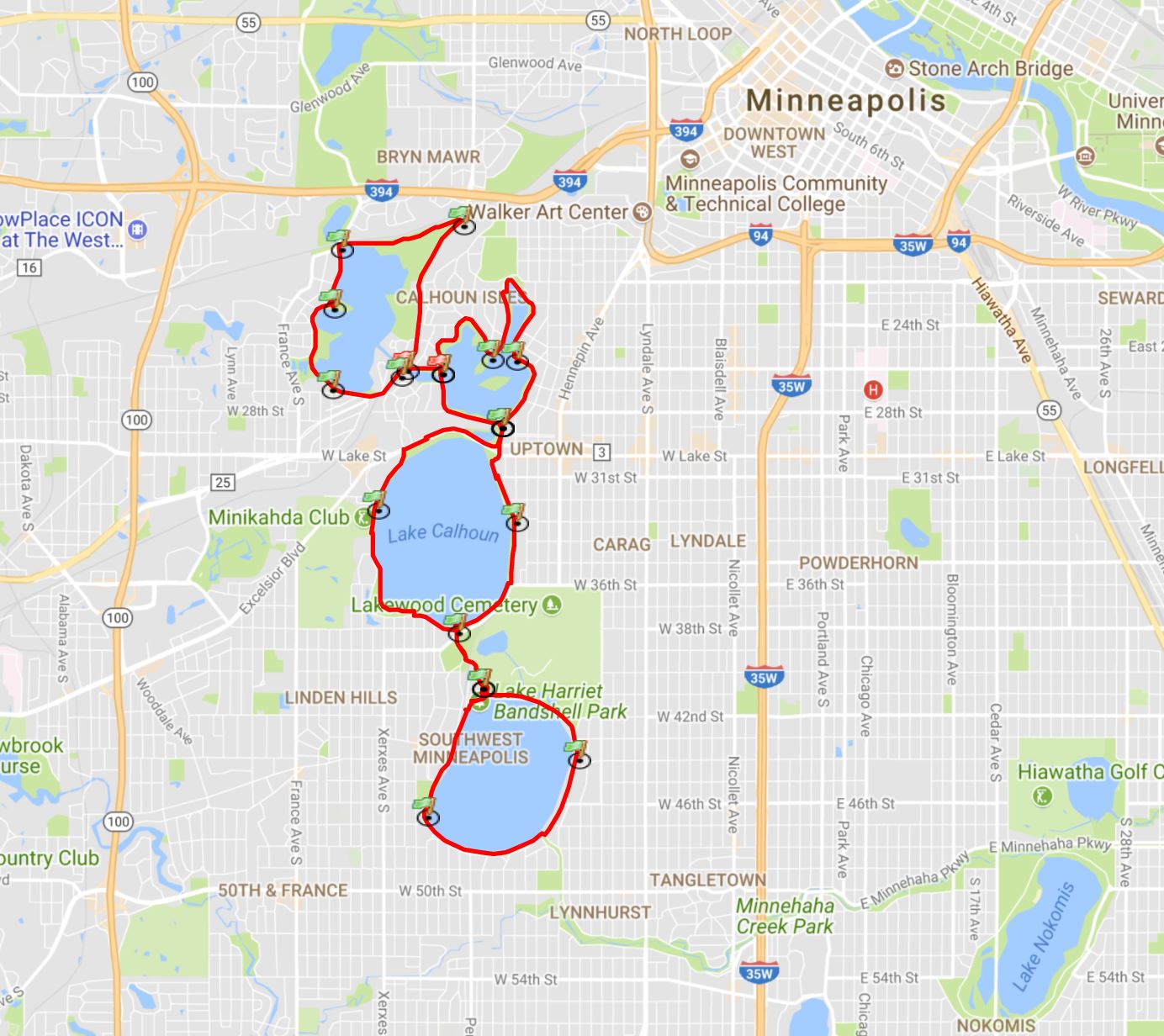 Individual Lake Distances: Cedar Lake, 1.68 miles | Lake of the Isles, 2.6 miles | Bde Maka Ska, 3.1 miles | Lake Harriet, 2.75 miles