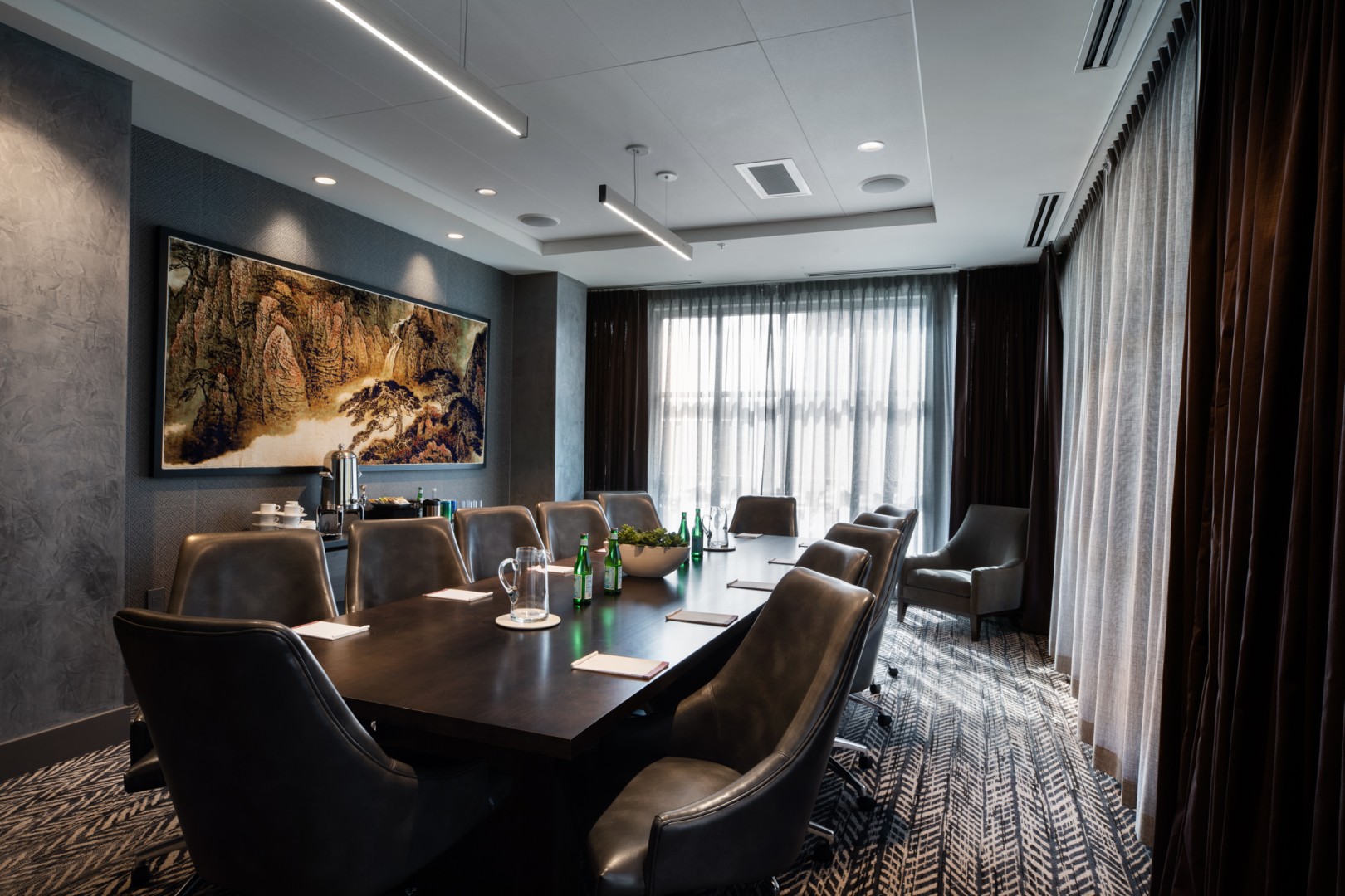 Height: 10Host your business meeting or executive strategy session in our sophisticated boardroom with expansive views and wet bar. Offering the latest technology with large screen TV, this 488 sq ft setting is ideal for small meetings of up to 14 attendees.